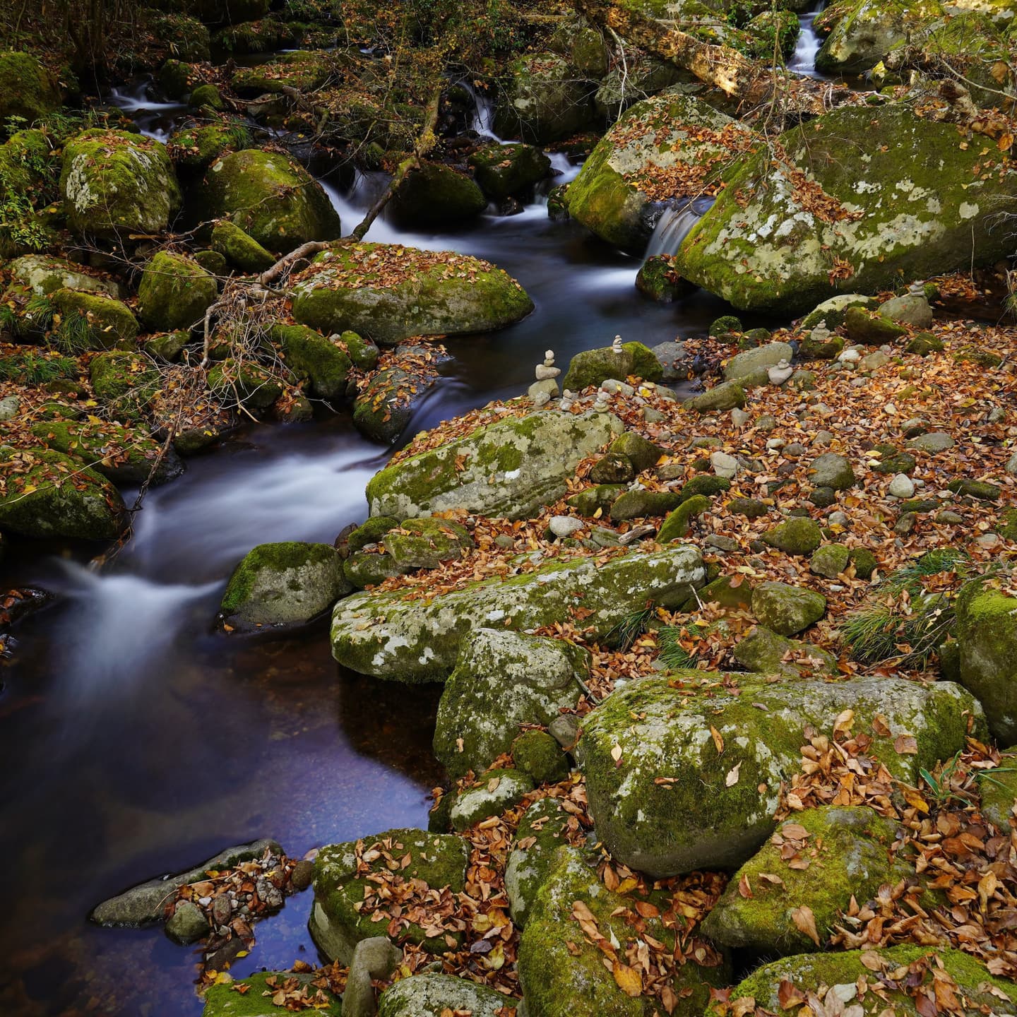 落ち葉と清流のコントラスト