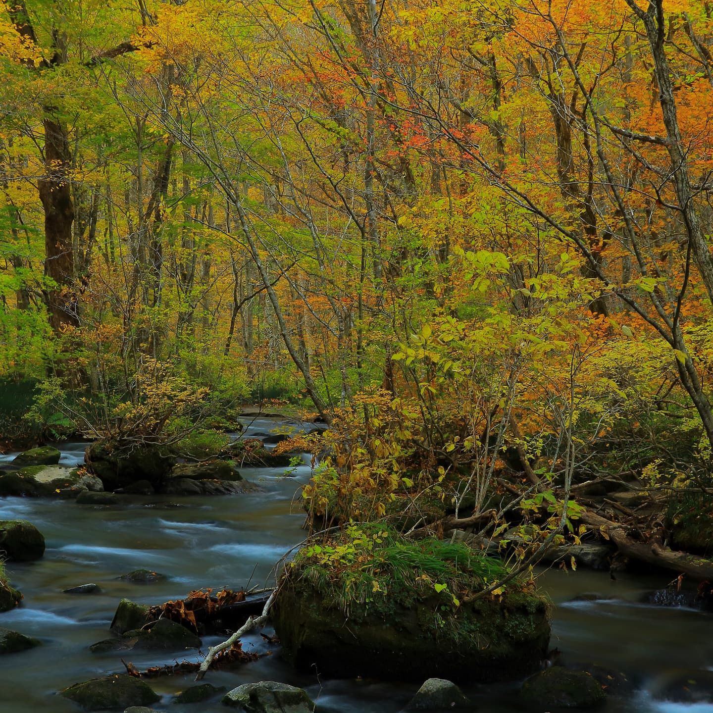 落ち葉と清流のコントラスト