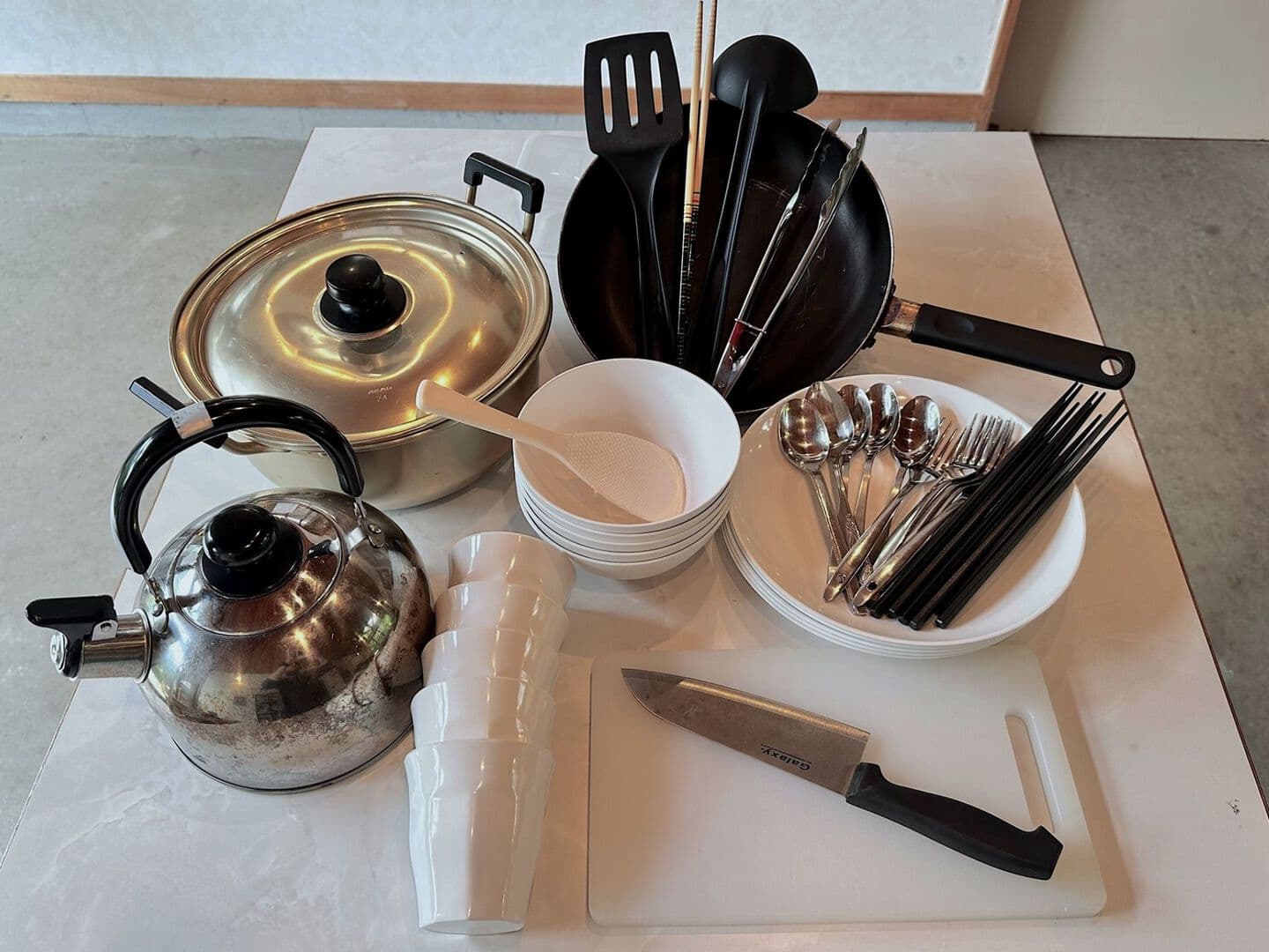- 「調理器具一式」内容:お箸・スプーン・フォーク・包丁・まな板・とんぐ・へら・フライパン返し・お皿・お茶碗・コップ・鍋・フライパン・やかん