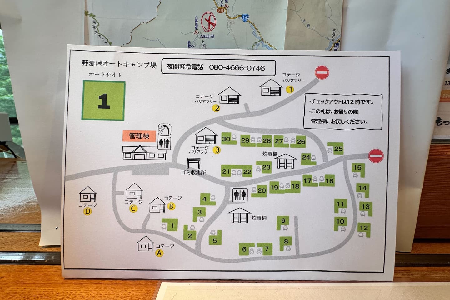 - ●全サイト共通:スタッフからキャンプ場の全体について、サイト区画のご案内(マップ)をお渡ししながらご説明いたします。併せて、「サイトカード(番号札)」、「熊すず」、「ゴミ袋」と、必要な客様には「レンタル品」をお渡しいたします。